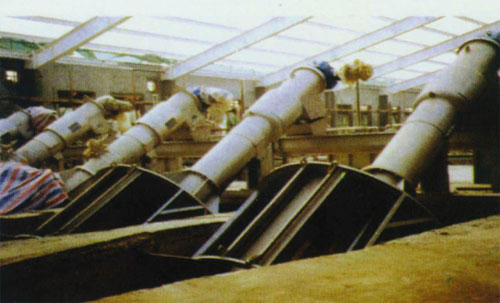 污水由下端面進入轉鼓型格柵內,垃圾被轉鼓格柵阻擋,回轉式齒耙將垃圾沿轉鼓方向往上推,到頂部時,由于受到重力及刮刷的作用,使垃圾落入正正文的集污槽內,由螺旋輸送機將垃圾輸送到卸污口處,裝袋或其它形式將垃圾運走。